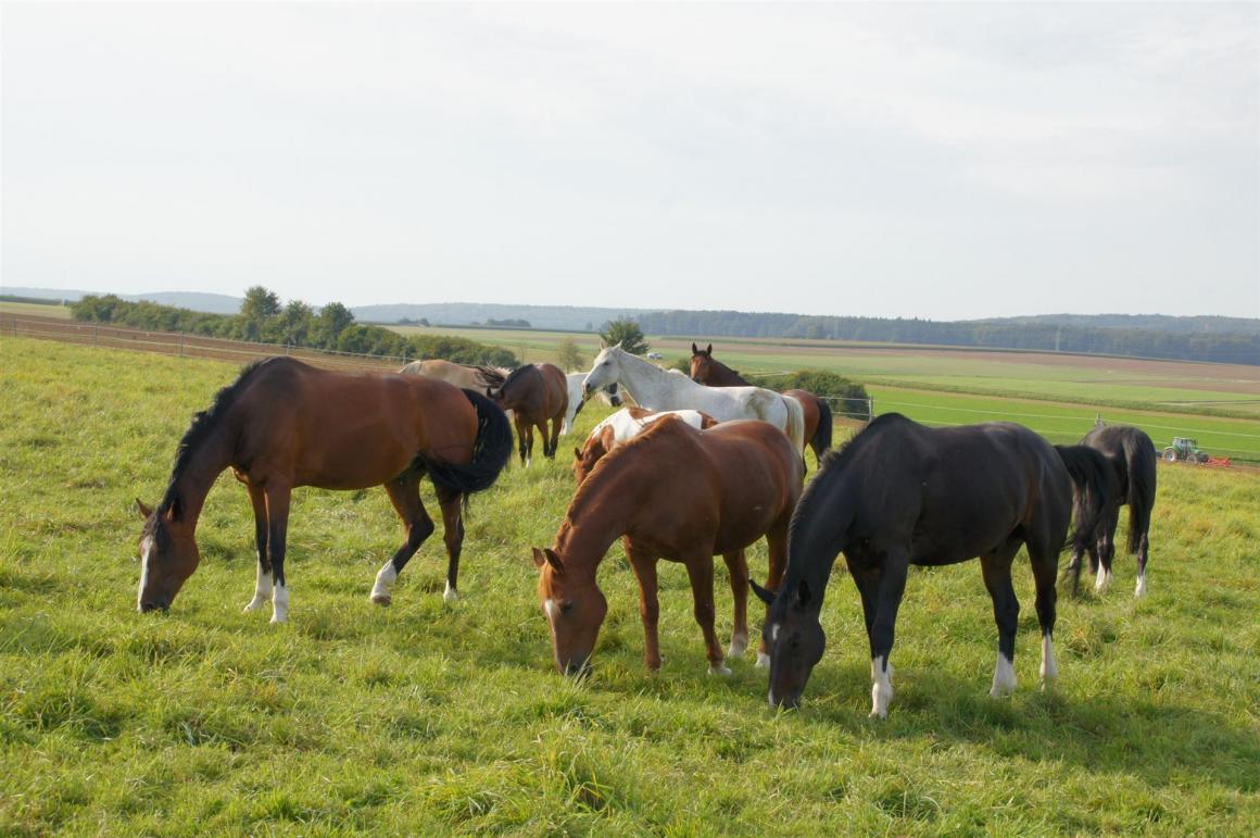 > die Pferde werden in einer Wallach- und in einer Stutenherde auf große Koppeln gelassen
